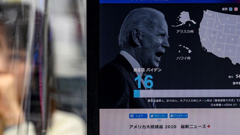 A news website shows a portrait of US presidential candidate Joe Biden at a foreign exchange trading company in Tokyo on November 4, 2020, as Asian markets react to early predictions following the US presidential election. Philip FONG / AFP