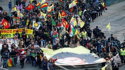 ولوح المتظاهرون بأعلام تحمل صورة عبد الله أوجلان، كما رفعوا يافطات كتب عليها "أردوغان إرهابي" و "الحرية لأوجلان" في إشارة للزعيم المسجون لحزب العمال الكردستاني المحظور في تركيا وألمانيا نفسها، ويعتبر الاتحاد الأوروبي والولايات المتحدة حزب العمال الكردستاني منظمة إرهابية.