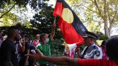 وتجمع حوالي 3000 شخص في سيدني في مسيرة “يوم الغزو” بالرغم من تهديد الشرطة في وقت سابق بشن اعتقالات جماعية إذا تجاوزت الحشود الحد الأقصى البالغ 500 شخص بسبب جائحة فيروس كورونا.
