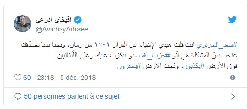 وجه المتحدث الرسمي باسم الجيش الإسرائيلي أفيخاي أدرعي رسالة إلى رئيس الحكومة اللبنانية المكلف سعد الحريري، دونها على "تويتر" بالعامية اللبنانية، مفادها ان "حزب الله بعدو بيكزب عليك".