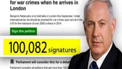 وقع أكثر من 107 آلاف شخص على عريضة في بريطانيا تدعو إلى اعتقال رئيس الوزراء الاسرائيلي بنيامين نتنياهو - لاتهامه بارتكاب جرائم حرب - عندما يزور لندن هذا الأسبوع لإجراء محادثات مع رئيس الوزراء ديفيد كاميرون.