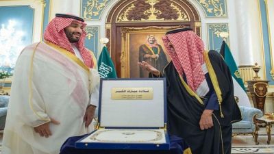 تداول ناشطون على مواقع التواصل الاجتماعي، فيديو يظهر ولي العهد السعودي الأمير محمد بن سلمان، وهو يتلقى قلادة مبارك الكبير، من أمير الكويت الشيخ نواف الأحمد.