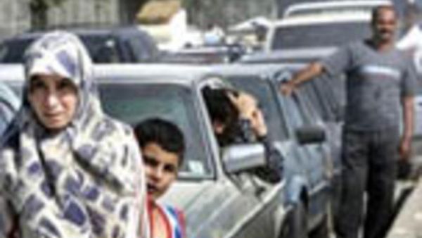 وكانت مئات السيارات المحملة بالامتعة والفرش والعائلات متوقفة تحت اشعة الشمس الحارقة.