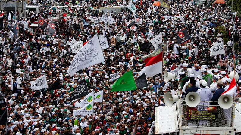 تظاهر آلاف المسلمين، اليوم الإثنين، خارج السفارة الفرنسية في العاصمة الإندونيسية جاكرتا، ضد الرئيس الفرنسي، إيمانويل ماكرون، مطالبين بطرد السفير الفرنسي على الفور.