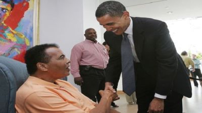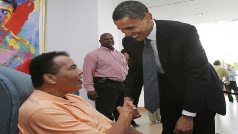 وأشار أوباما إلى أنه يحتفظ في غرفته الخاصة بالقرب من المكتب البيضاوي بقفازي محمد علي، مباشرة تحت صورة الملاكم الأسطورة "البطل الشاب الذي كان لا يتجاوز 22 من عمره وهو يزأر كالأسد فوق سوني ليستون الساقط أرضا" في إشارة إلى المباراة الشهيرة بين الملاكمين في 25 مايو/1964.