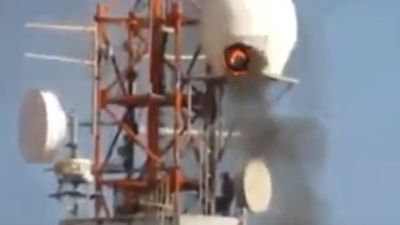 تداول ناشطون على وسائل التواصل الاجتماعي شريط فيديو يظهر قيام متظاهرين فلسطينيين بإحراق برج اتصالات عسكري إسرائيلي على الشريط الحدودي شرقي مدينة رفح في قطاع غزة.