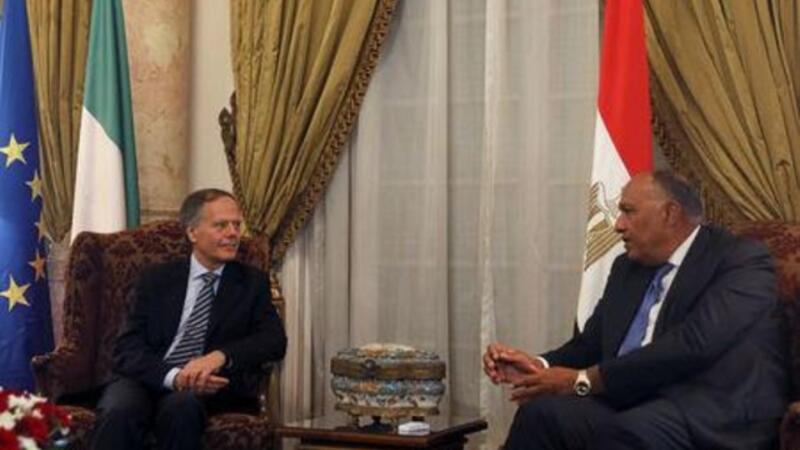 وزير الخارجية المصري سامح شكري (إلى اليمين) خلال اجتماع مع نظيره الايطالي إنزو موافيرو ميلانيزي في القاهرة يوم الاحد