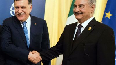 ويحظى حفتر بدعم مصر والإمارات وروسيا، في حين تحظى حكومة الوفاق التي يرأسها فايز السراج وتعترف بها الأمم المتحدة بدعم تركيا وقطر.