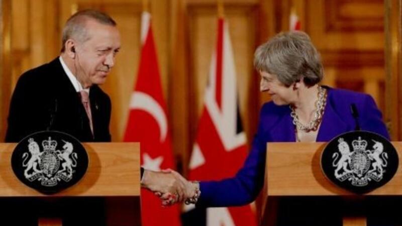 رئيسة الوزراء البريطانية تيريزا ماي تصافح الرئيس التركي رجب طيب اردوغان خلال مؤتمر صحافي مشترك في لندن