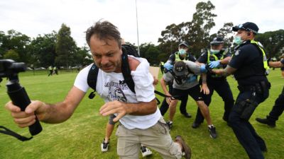 اشتبك مئات المتظاهرين المناهضين للتطعيم ضد وباء كورونا، اليوم السبت، في حديقة فوكنر بمدينة ملبورن في أستراليا مع الشرطة التي حاولت منعهم من تنظيم وقفتهم الاحتجاجية.