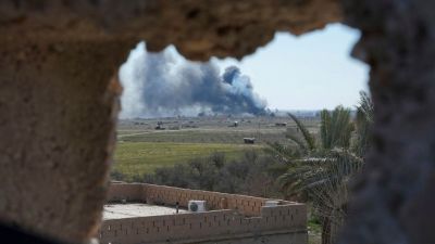 وأظهرت صور من رويترز نشرت الأحد أعمدة كثيفة من الدخان الأسود تتصاعد فوق منازل وأشجار نخيل بينما كان مقاتلو قوات سوريا الديمقراطية يطلقون النار على مخابئ التنظيم.