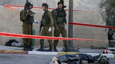 شهيد فلسطيني ملقى على الارض بجانب جنود الاحتلال/ ارشيفية