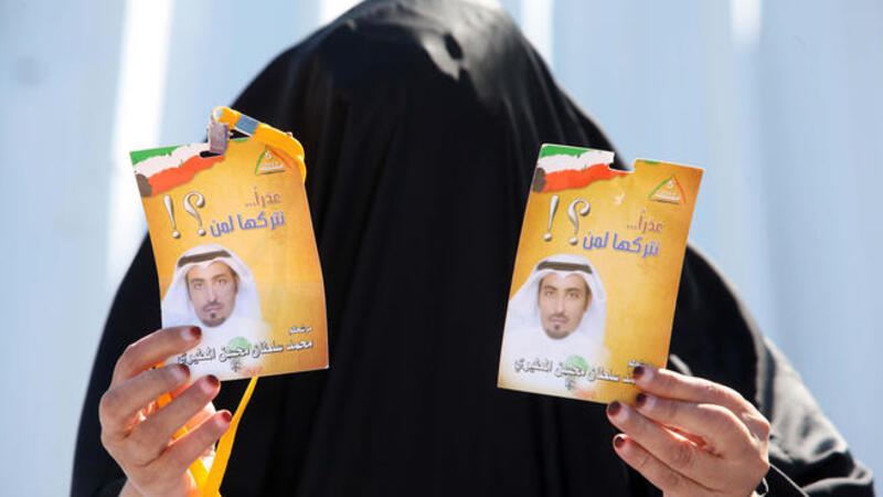كويتية تحمل ملصقات دعائية لمرشح بعد خروجها من مركز اقتراع/أ.ف.ب