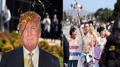 استقبل المئات من المحتجين، دونالد ترامب المرشح الجمهوري المحتمل للرئاسة الأمريكية في انتخابات 2016، بالبيض وصدور النساء العارية في ولاية كاليفورنيا.