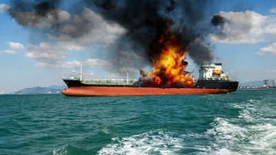 حريق في سفينة شحن. سفينة محمّلة بالغاز المسال تلتهمها النيران. انفجار وحريق.