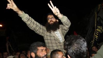 خضر عدنان يلوح بعلامة النصر عقب وصوله الى قريته قرب جنين في الضفة الغربية بعد اطلاق اسرائيل سراحه يوم 17 ابريل نيسان