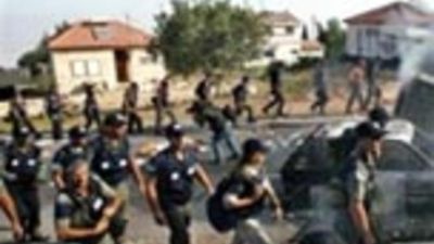 وخرج رجال الشرطة من الرافعة الى السطح في حين غمر مدفع مياه المحتجين الذين تحدوا خطة رئيس الوزراء ارييل شارون لتفكيك بعض الجيوب اليهودية بالضفة الغربية.