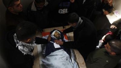 فلسطينيون يلتفون حول جثة الشاب محمد عصفور في مشرحة مستشفى في رام الله