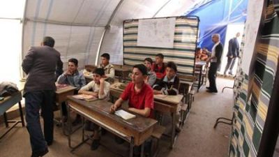اطفال يحضرون درسا في مخيم للنازحين السوريين في اعزاز