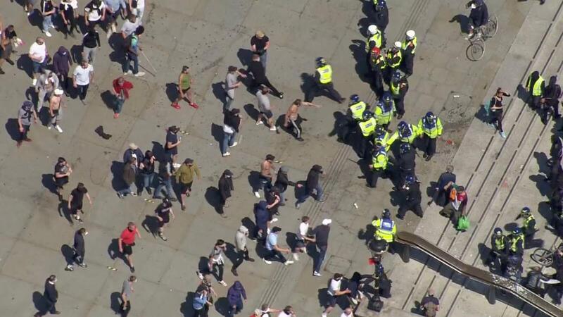قال شهود إن اشتباكا نشب بين محتجين من اليمين المتطرف والشرطة في ميدان الطرف الأغر في العاصمة البريطانية لندن، وجرى خلال ذلك إطلاق مفرقعات ورشق زجاجات السبت أثناء محاولة أفراد الشرطة فصلهم عن محتجين مناهضين للعنصرية.