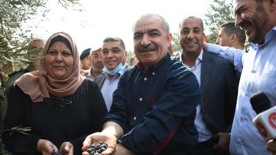 رئيس الوزراء الفلسطيني محمد اشتية خلال مشاركته في قطاف الزيتون في محافظة سلفيت