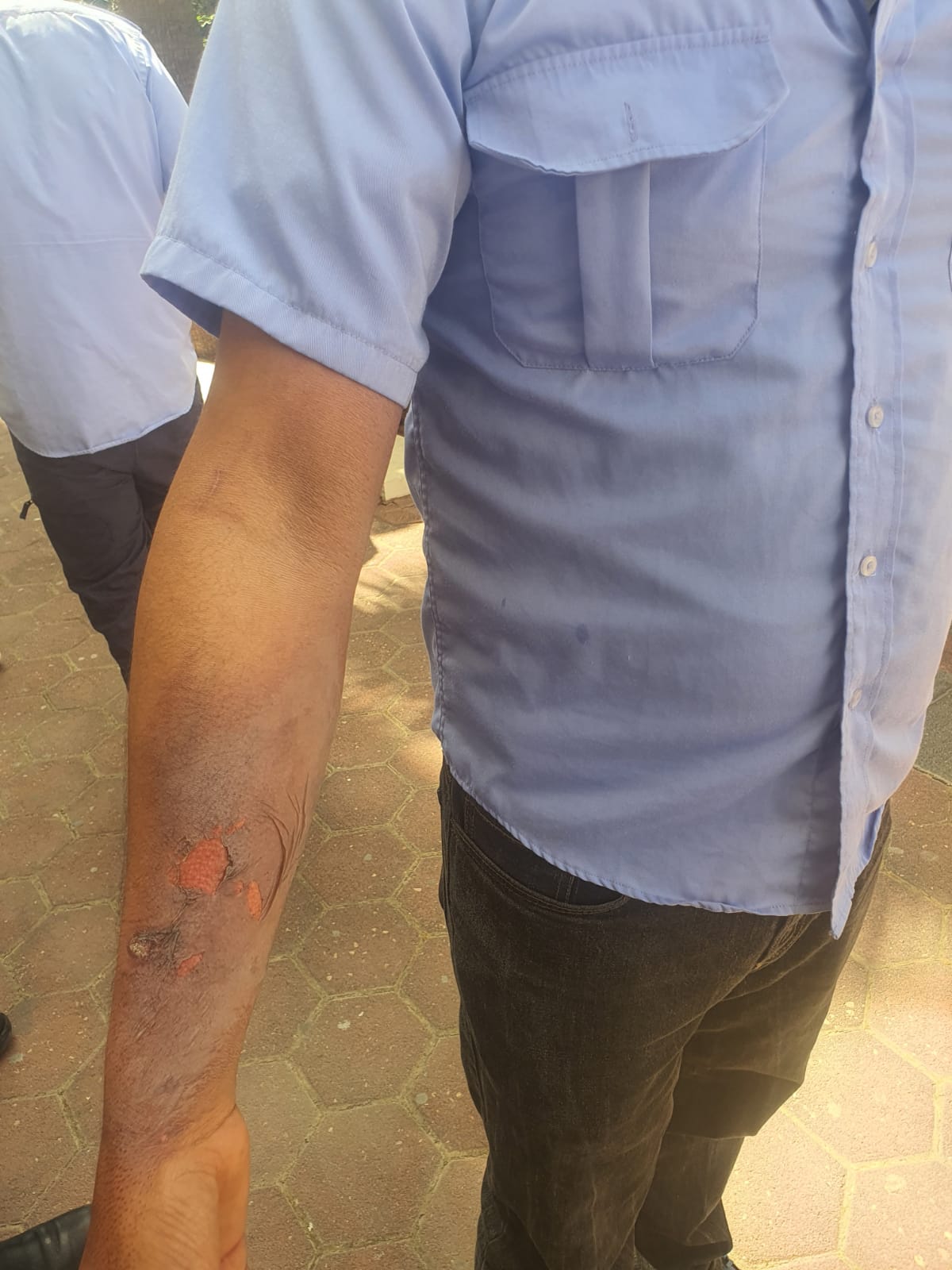 الى ذلك وصل البوابة صورا لامن الجامعة وقد اصيبو بمواد كيماوية غريبة قالت المصادر ان المعتصمين الموالين لحماس استخدموها ضدهم واشارت المصادر الى ان عناصر حماس استخدمو ايضا الالات الحادة والشفرات والمفكات في الاعتداء على امن الجامعة