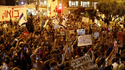 والسبت الماضي خرج آلاف الأشخاص السبت للمشاركة في مظاهرات ضد رئيس وزراء إسرائيل، بنيامين نتنياهو، أكبرها أمام مقر إقامته في القدس ومنزله في قيساريا، فيما لجأت الشرطة للقوة لتفريق المتظاهرين.