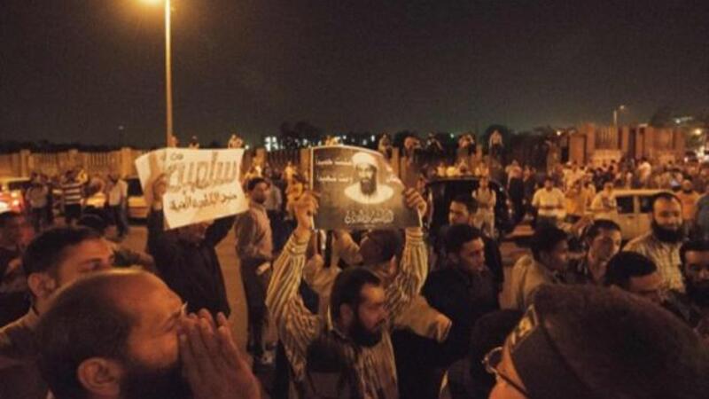 واعتلى عدد من المتظاهرين أسوار مبنى الجهاز رافعين أعلاماً سوداء وبيضاء رمز السلفية الجهادية، فيما قام آخرون بكتابة عبارات “كلنا أسامة بن لادن” في إشارة إلى مؤسس تنظيم القاعدة”، و”جهاز أمن صهيون”، ورسموا “نجمة داوود”، فيما حاولت مجموعة اقتحام البوابة الرئيسية للجهاز، فقامت عناصر أمنية بمطاردتهم، فيما ألقت عناصر أمنية بإطلاق الغاز المسيِّل للدموع لتفريق المتظاهرين.