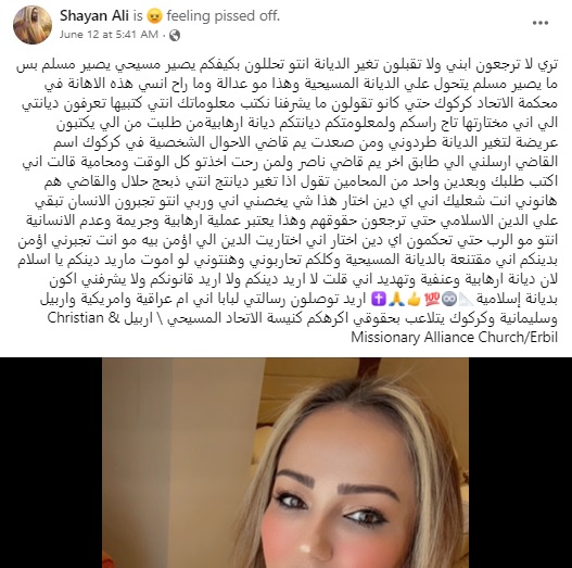 وتابعت شايان علي "لو اموت ماريد دينكم يا اسلام لان ديانة ارهابية وعنفية وتهديد اني قلت لا اريد دينكم ولا اريد قانونكم ولا يشرفني اكون بديانة إسلامية".