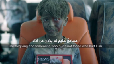 ويظهر في الإعلان مشهد تمثيلي لشخص يحمل حزاماً ناسفاً يدخل في حافلة تقل عدداً من الركاب وهو يردد (الله أكبر الله أكبر)، ويستمر المشهد التمثيلي على أن الانتحاري يريد أن يفجر نفسه وسط الحافلة، وبعد ذلك يظهر في أحد المشاهد الطفل عمران وهو يردد "مسامحٌ حليم لا يؤذي من أذاه"، في مشاهد منافية للحقيقة التي تجرعها الطفل ونقلتها جميع وسائل الإعلام العربية والغربية والأجنبية.