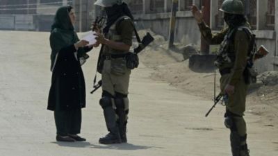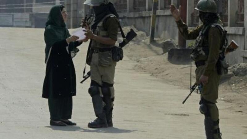 جنديان هنديان يستوقفان كشميرية خلال اضراب ليوم دعاه إله الانفصاليون في سريناغار