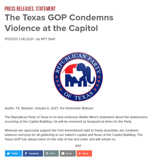 وجاء في بيان على موقع الحزب الجمهوري في تكساس: "بينما ندعم بقوة التعديل الأول للحق في التجمع بحرية، فإننا ندين العنف ونصلي من أجل جميع التجمعات في عاصمة بلادنا وتلك الموجودة في مبنى الكابيتول. لقد كان الحزب الجمهوري في تكساس دائما إلى جانب القانون والنظام وسيظل كذلك"
