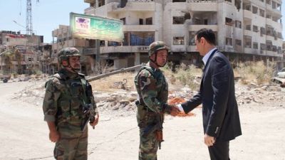 نشرت صفحة رئاسة الجمهورية العربية السورية على الفيسبوك، صورا للرئيس السوري بشار الأسد، وعقيلته أسماء، وهما يزوران أحد أنفاق الموت التي حفرها الإرهابيون في حي جوبر بدمشق.