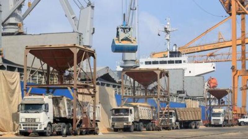 سفينة تفرغ حمولة من القمح في ميناء الحديدة على البحر الأحمر باليمن
