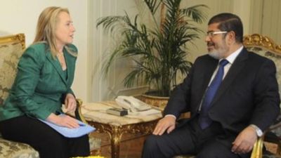 الرئيس المصري محمد مرسي ووزيرة الخارجية الاميركية هيلاري كلينتون في اجتماعهما الذي سبق الاعلان عن التهدئة