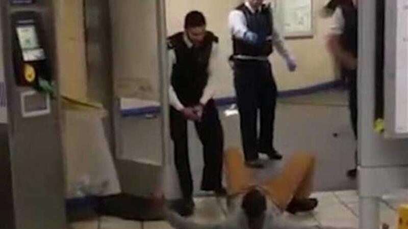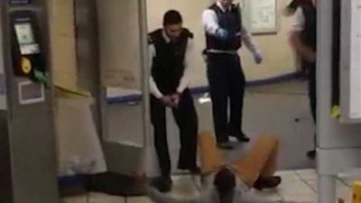 واستخدمت الشرطة مسدسا صاعقا ثلاث مرات للسيطرة على الرجل الذي سقط وافلت سكينه قبل ان يثبته الشرطيون ارضا.
