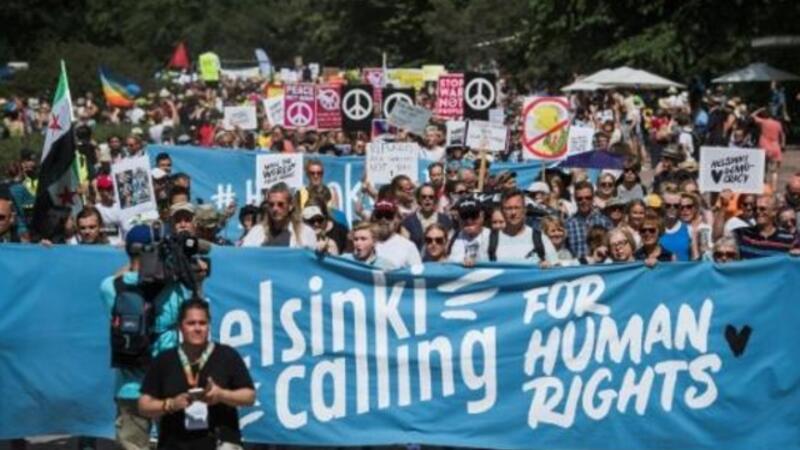 تظاهر الالاف الاحد في هلسنكي عشية القمة التاريخية في العاصمة الفنلندية بين دونالد ترامب وفلاديمير بوتين.