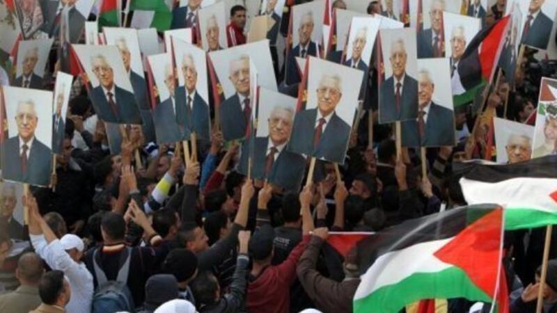 فلسطينيون يرفعون صورا للرئيس الفلسطيني محمود عباس في رام الله