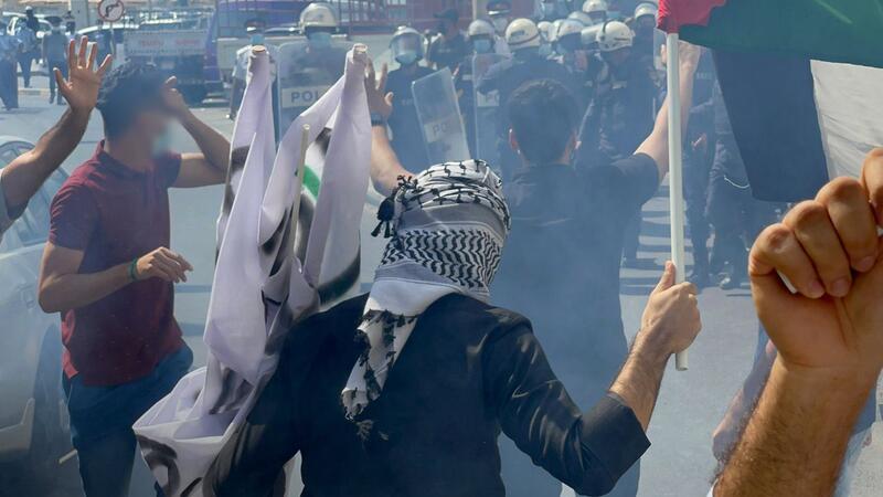 حاول المشاركون التوجه إلى مقر السفارة الإسرائيلية رافعين علم فلسطين ومرددين شعارات تندد بالتطبيع وتعبر عن دعم الشعب البحريني للقضية الفلسطينية.