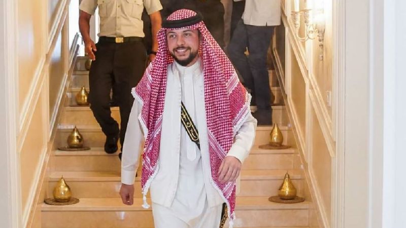 ظهر ولي العهد الاردني الاربعاء في حفلة "القرا" التي دعي اليها 4000 شخص واقيمت في مضارب الهاشميين يوم الاربعاء استعدادا لحفل زفافة يوم الخميس مرتديا الزي العربي التراثي