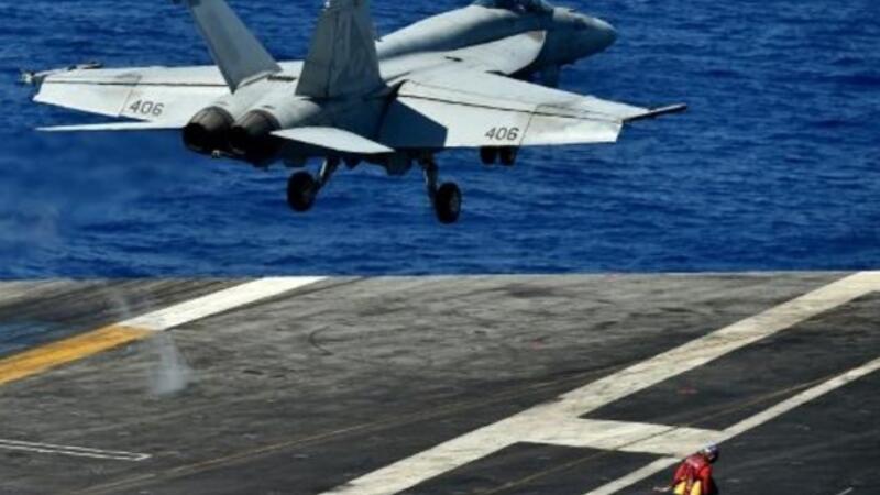 طائرة اف.ايه-18 سوبر هورنت تقلع من حاملة الطائرات الاميركية دوايت د. ايزنهاور
