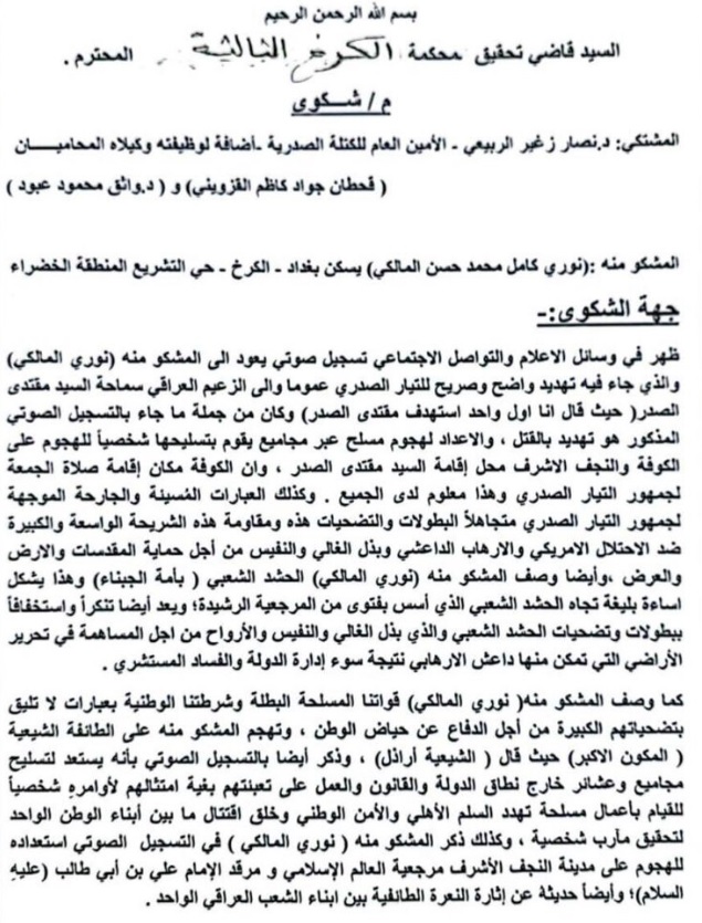 ونشرت وسائل اعلام عراقية نص الدعوى التي قالت ان الأمين العام للكتلة الصدرية نصّار الربيعي الى محكمة الكرخ الثالثة في العاصمة بغداد، والتي يطالب فيها باعتقال المالكي الذي يتزعم "ائتلاف دولة القانون".