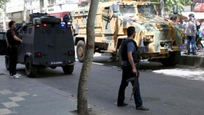 افراد أمن يحيطون بمركبة عسكرية تركية في مدينة ديار بكر