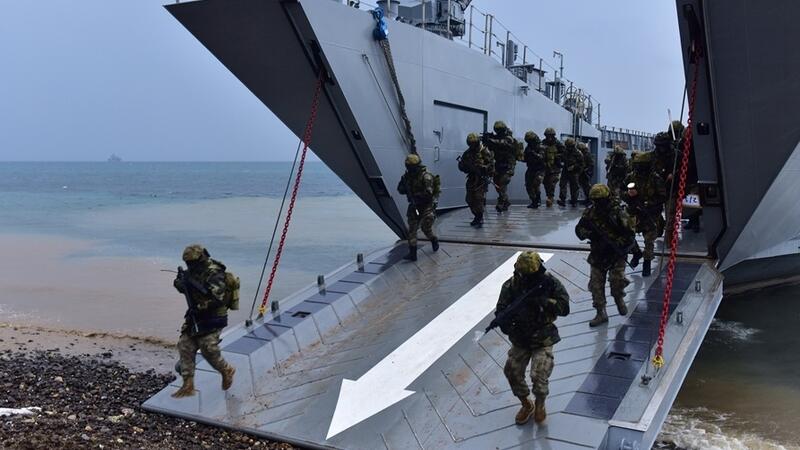 وشملت المناورات عمليات إنزال بحري بمشاركة مركبات برمائية لمشاة البحرية.