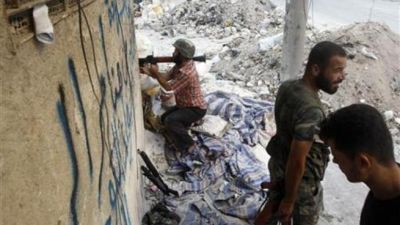مقاتل من الجيش السوري الحر يحمل قذيفة صاروخية في احد شوارع حلب