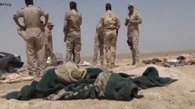 واظهرت صور وزعتها وزارة الدفاع العراقية عشرات الشاحنات الصغيرة وسيارات اخرى محملة بالأسلحة الثقيلة والاعتدة وجثث مسلحين متناثرة في منطقة صحراوية.