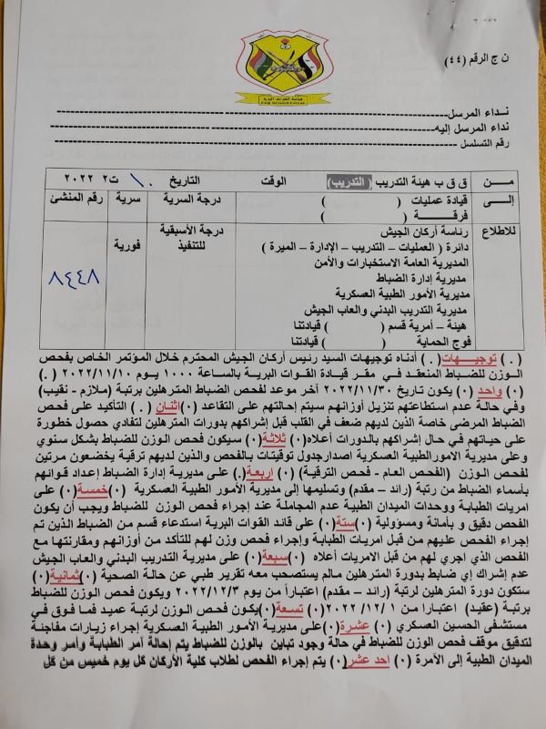 وطلب التعميم "فحص الضباط المرضى من الذين لديهم ضعف في القلب قبل إشراكهم بدورات "المترهلين" لتفادي حصول خطورة على حياتهم في حال إشراكهم بالدورات".