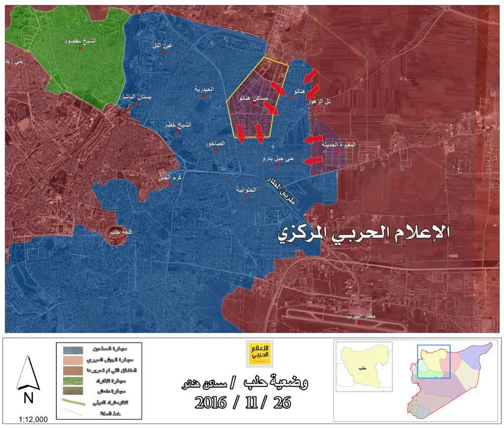 من جهته نشر الإعلام الحربي خريطة توضح سيطرة الجيش السوري على مساكن هنانو شرق حلب.