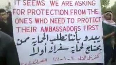لقطة عن موقع يوتيوب لمتظاهرين معارضين للنظام في كفرنبل في سوريا
