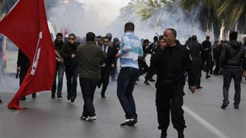 واستخدمت الشرطة الغاز المسيل للدموع والهراوات لتفريق المحتجين الذين كانوا يقذفون الحجارة واقتحموا شارع الحبيب بورقيبة يوم الاثنين في تحد لقرار حظر التظاهر في الشارع الذي كان مركزا للاحتجاجات التي أطاحت بالرئيس السابق زين العابدين بن علي الذي أطاحت به انتفاضة شعبية العام الماضي.